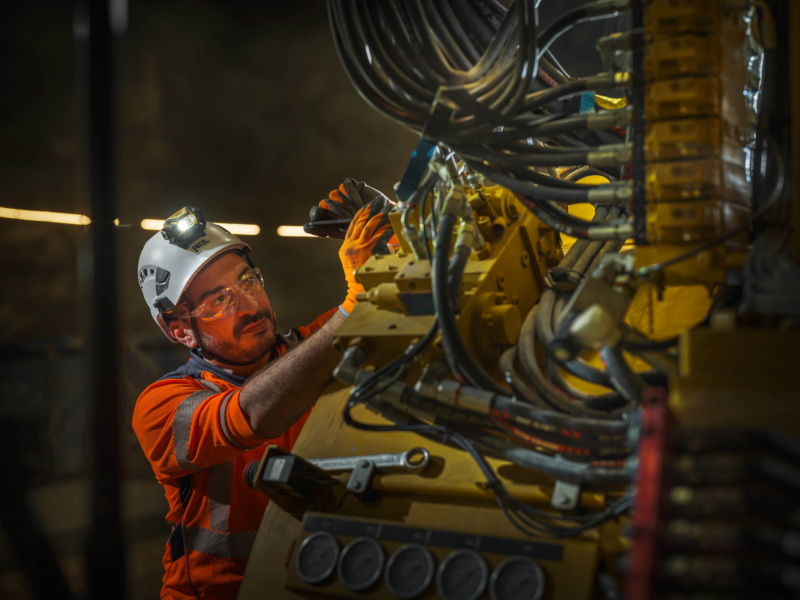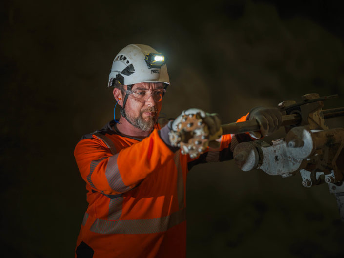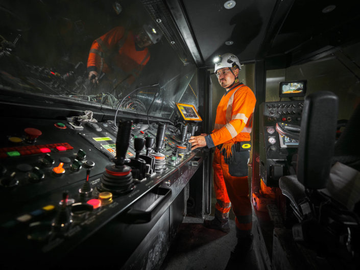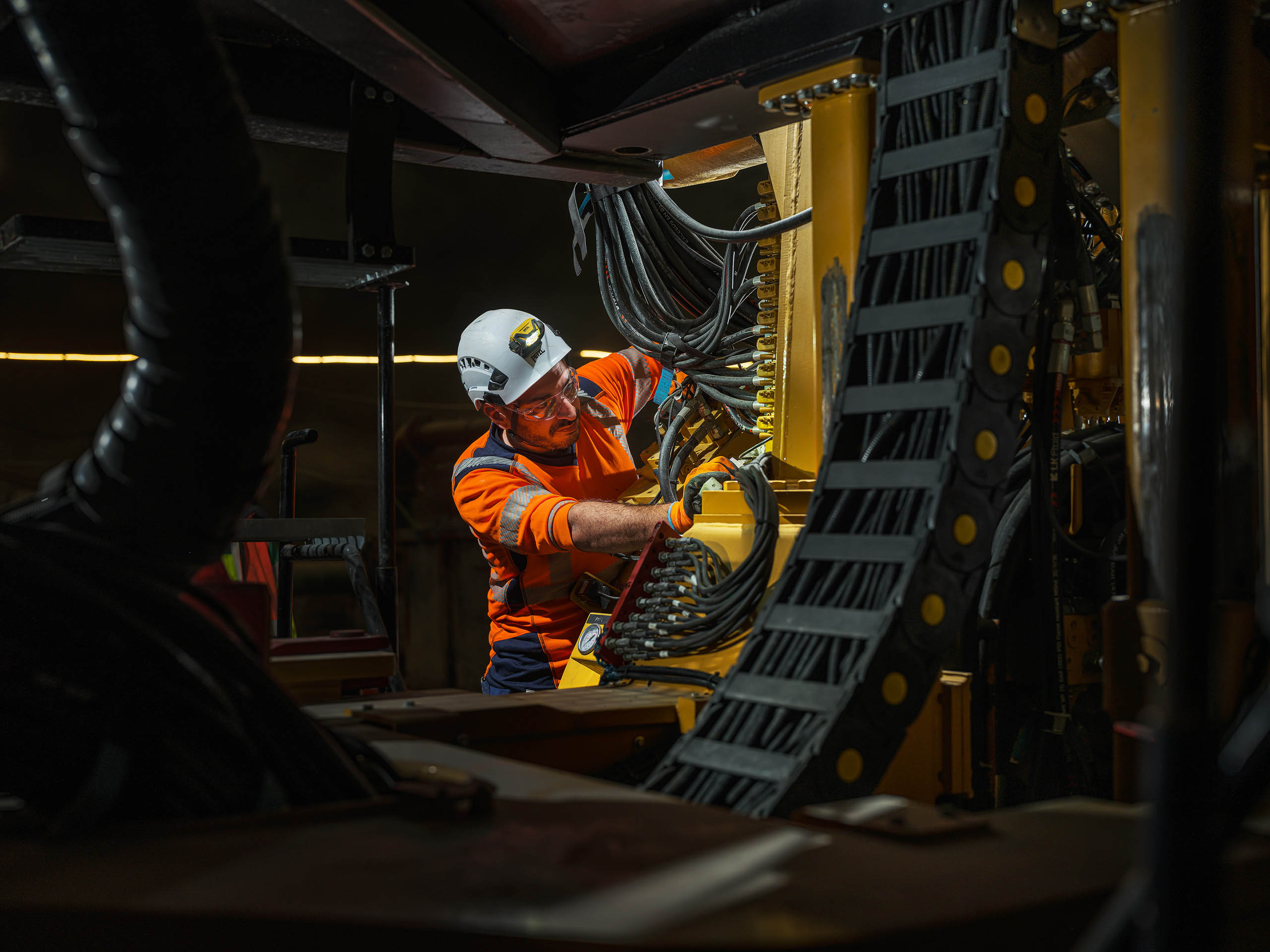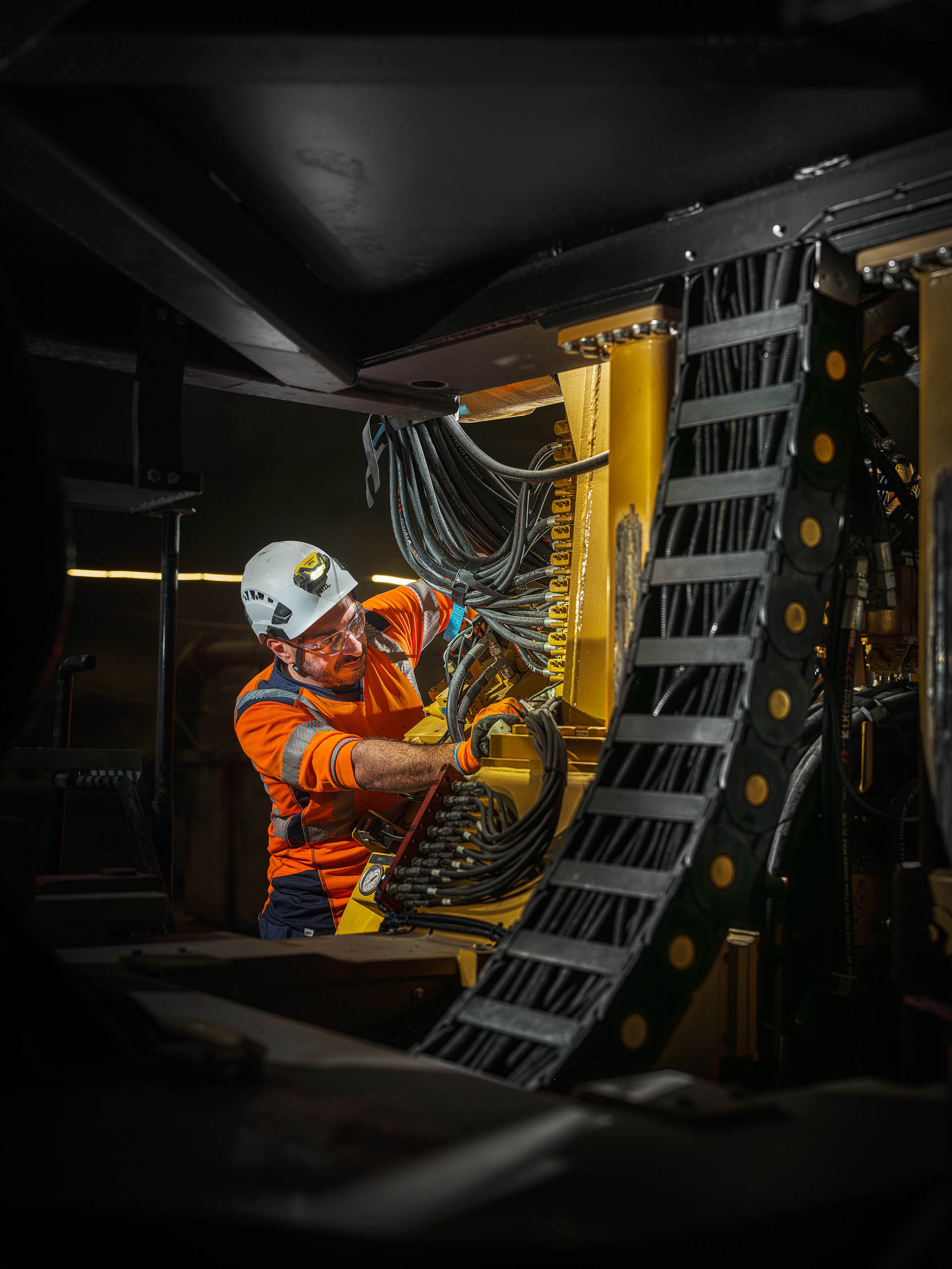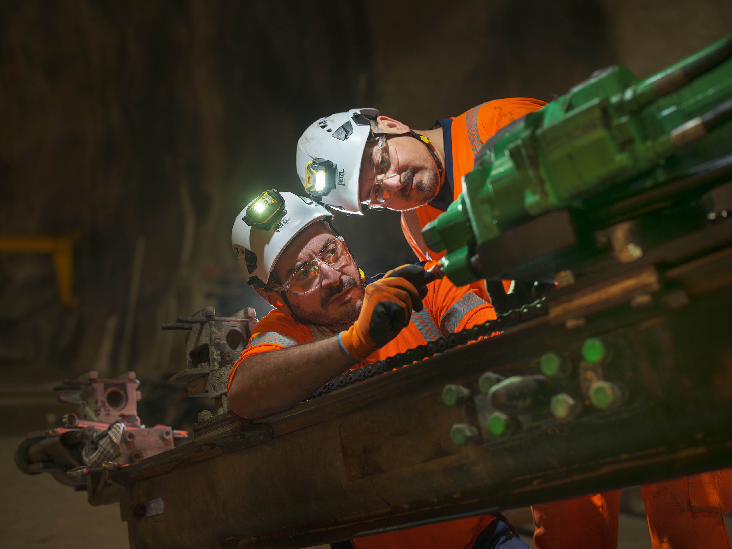 Dans cet environnement souterrain extrême, la lumière artificielle révèle la puissance mécanique des engins et l’engagement humain permanent.