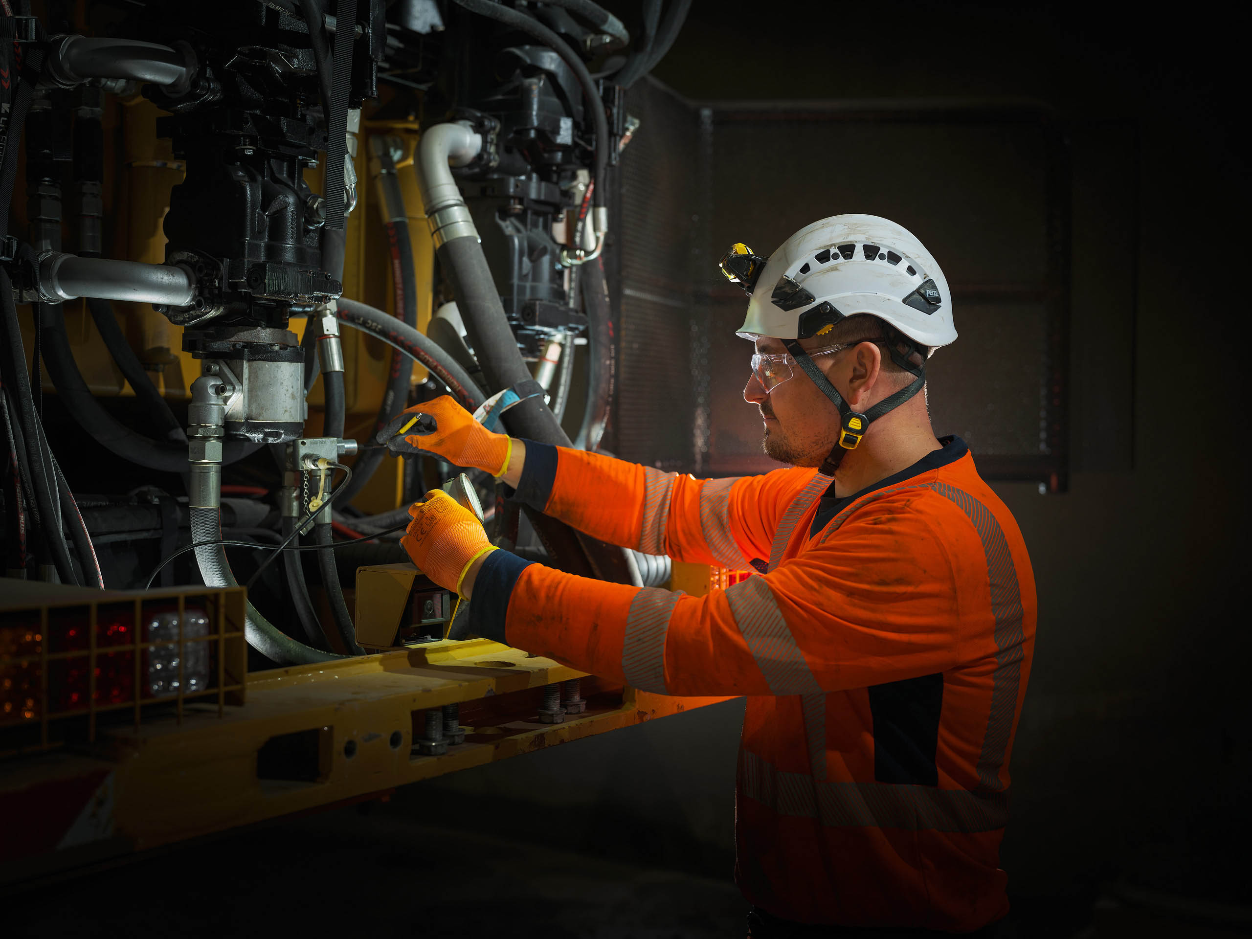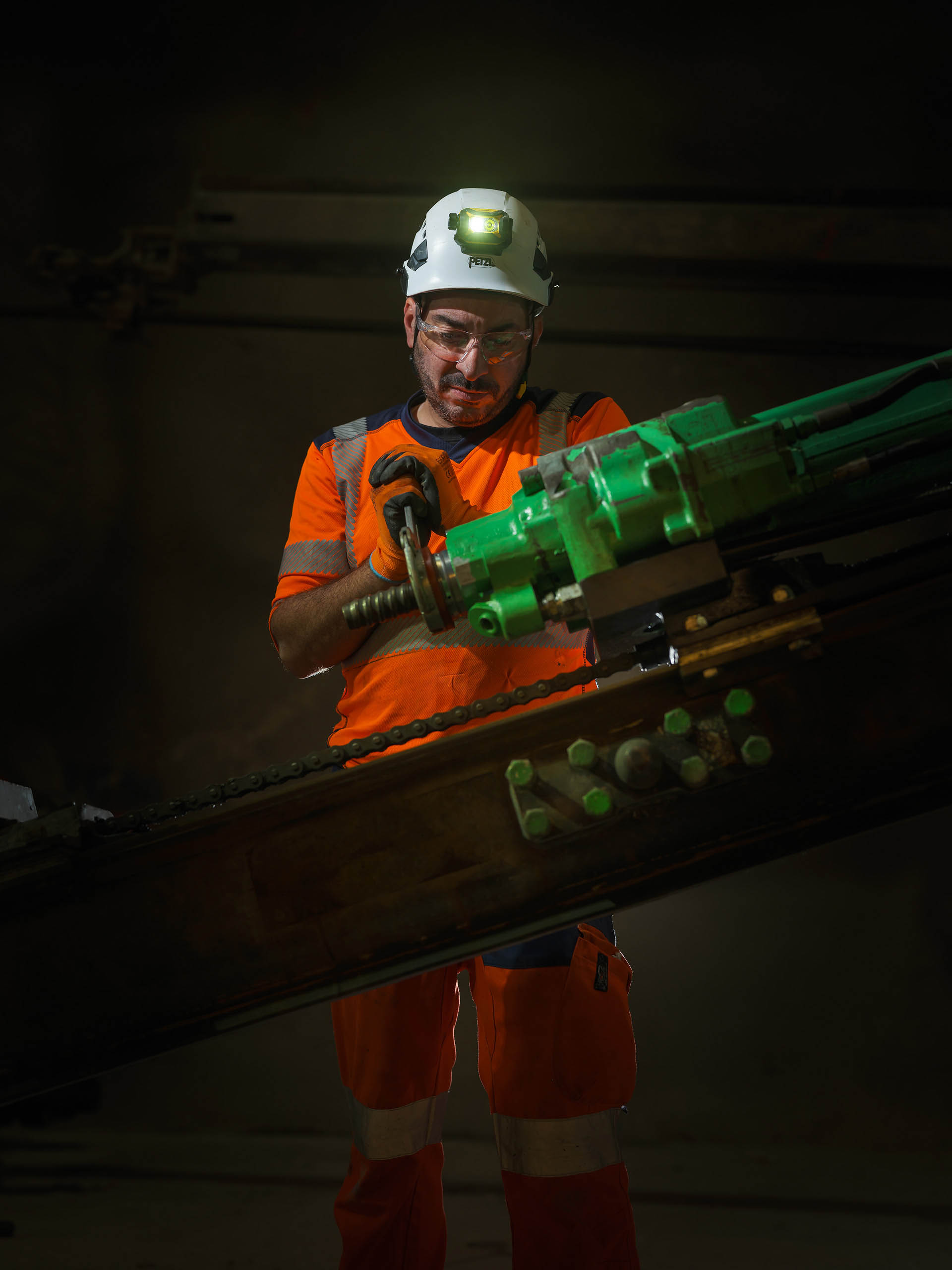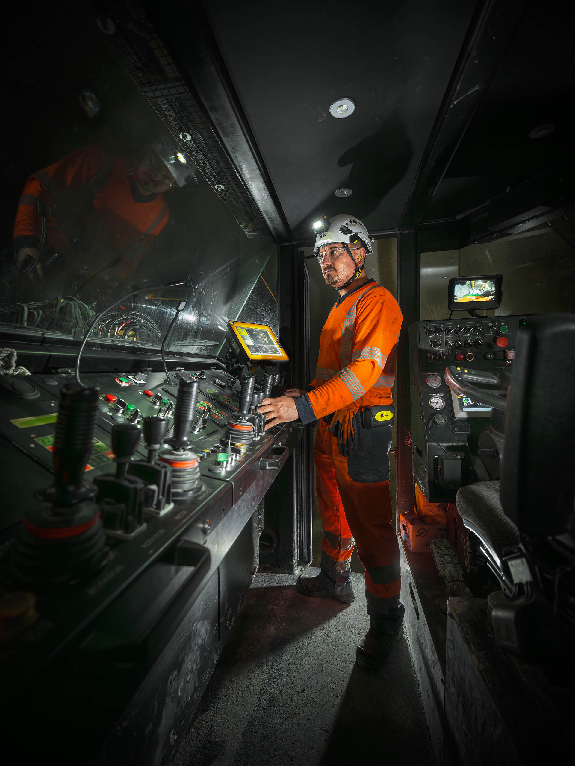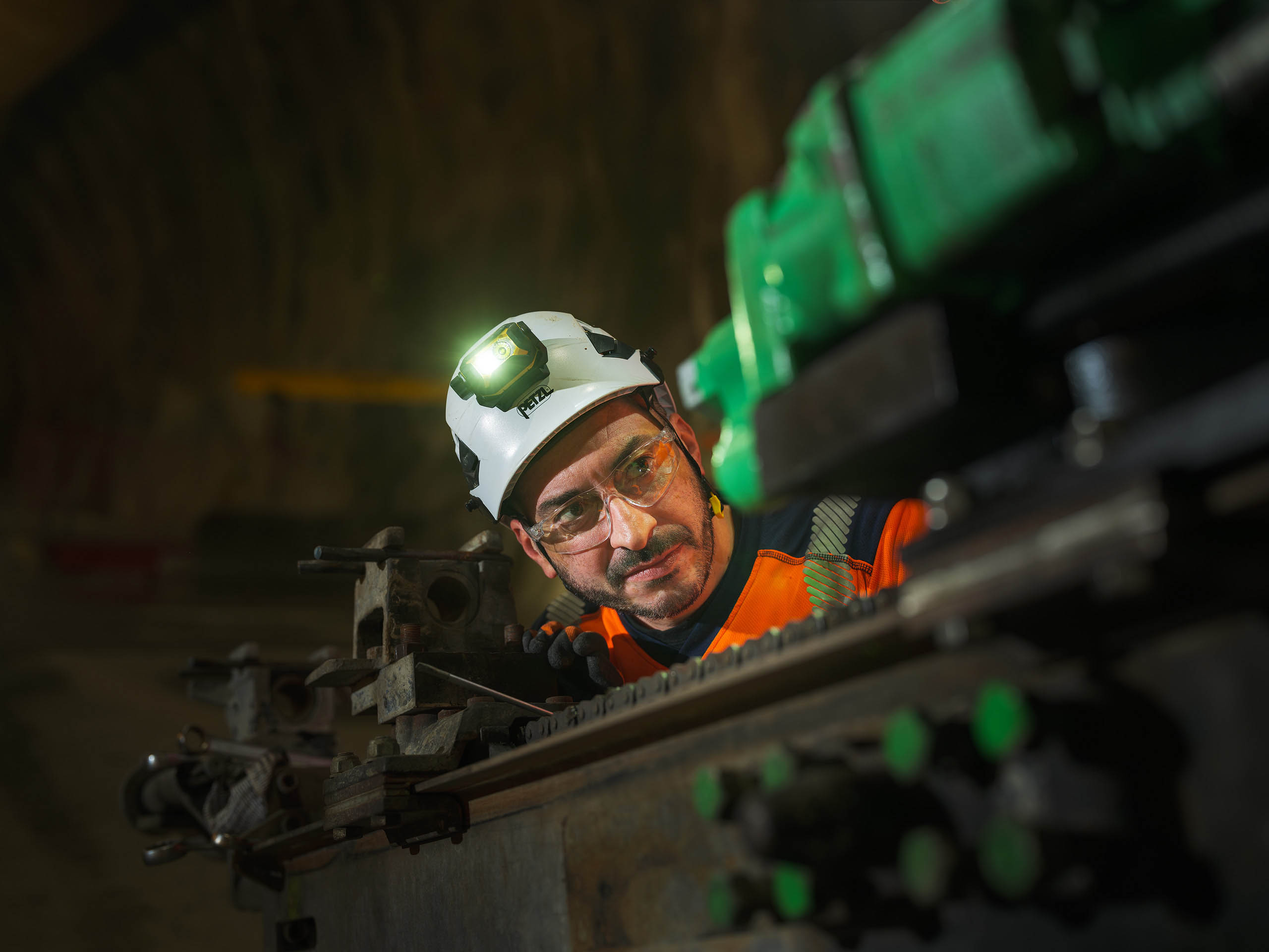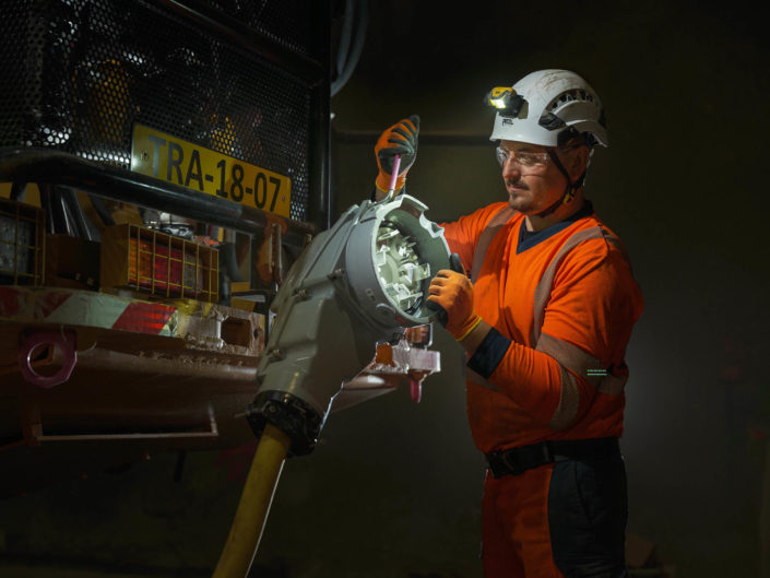 Dans cet environnement souterrain extrême, la lumière artificielle révèle la puissance mécanique des engins et l’engagement humain permanent.