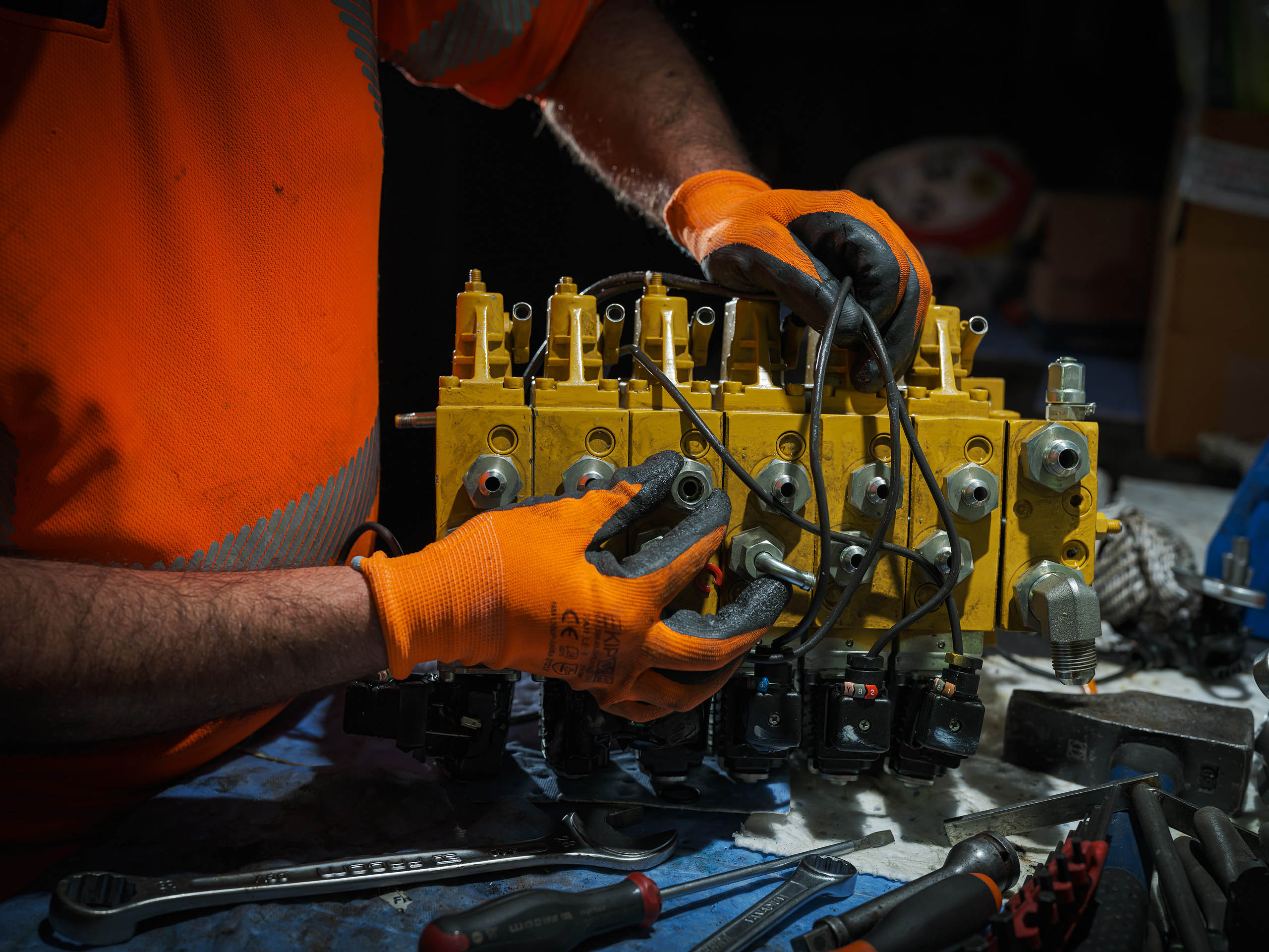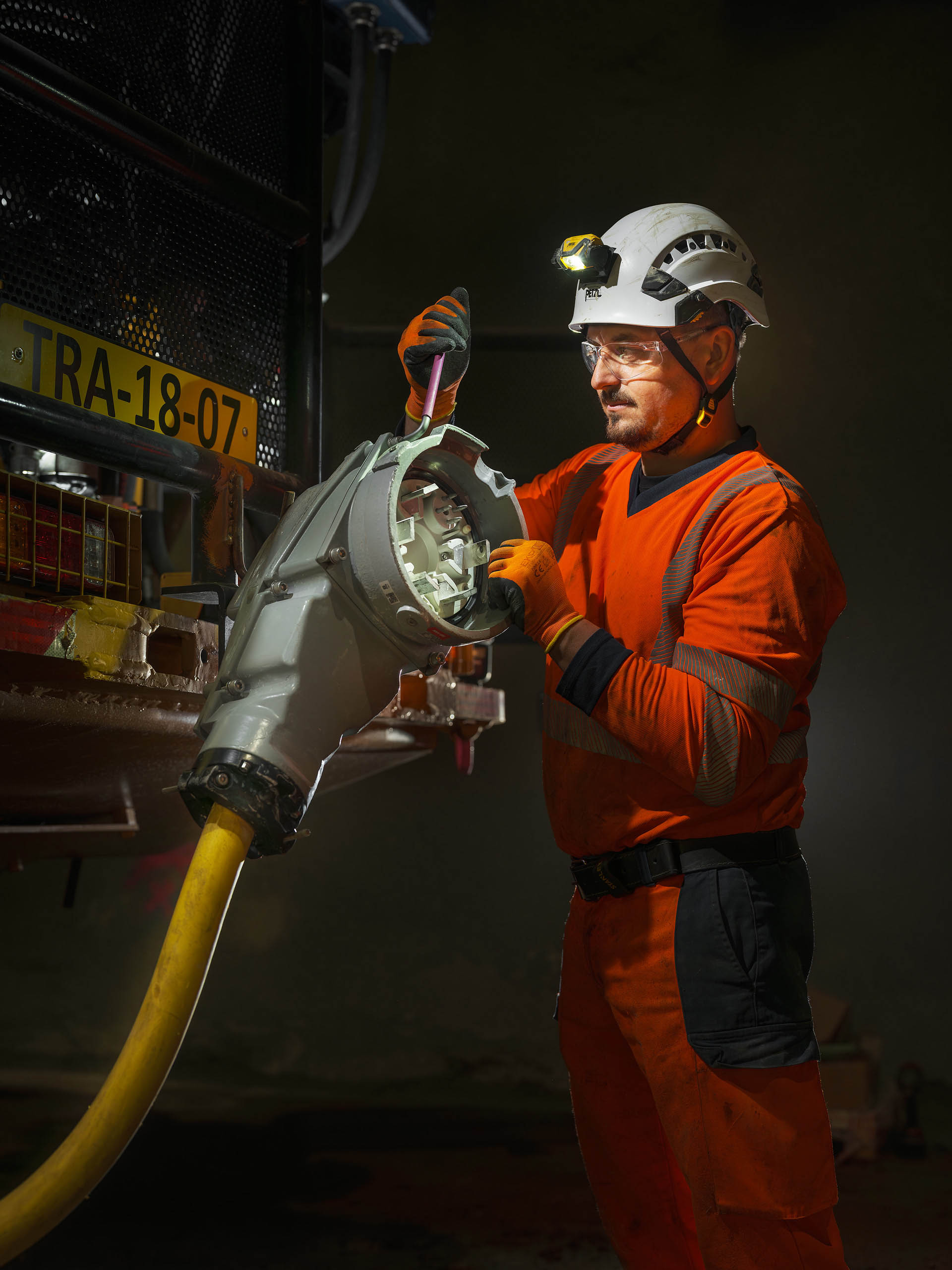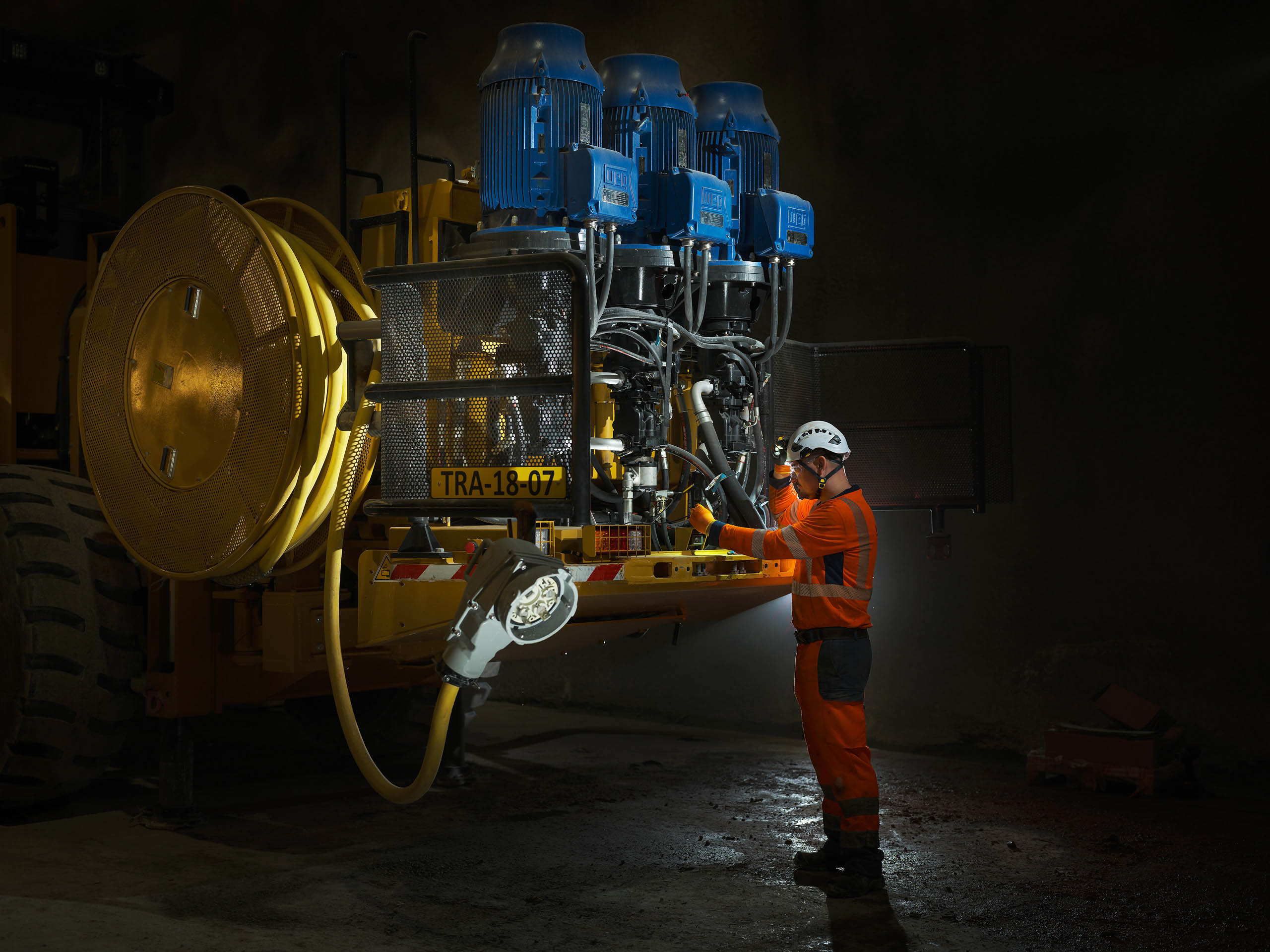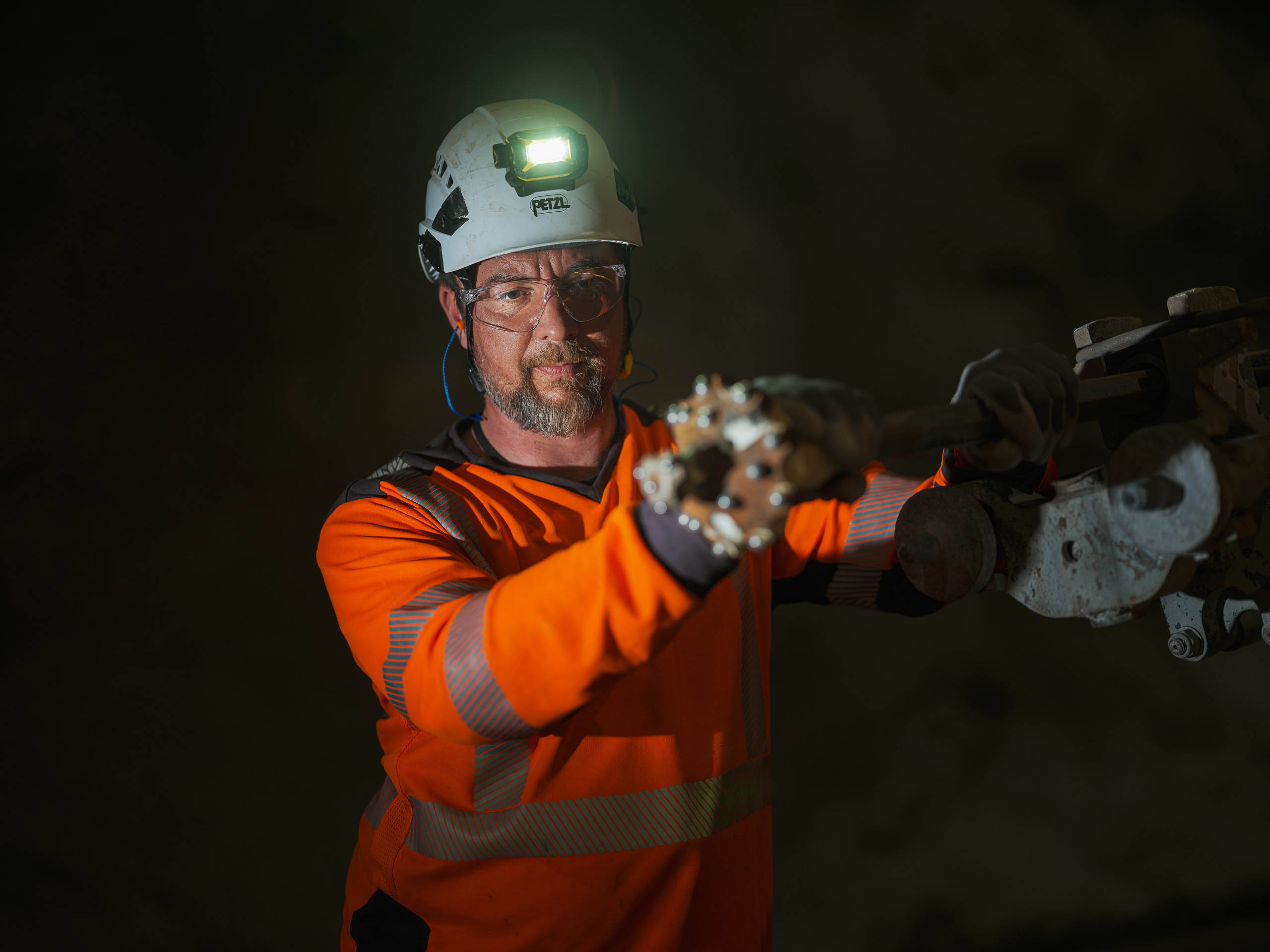 Dans cet environnement souterrain extrême, la lumière artificielle révèle la puissance mécanique des engins et l’engagement humain permanent.