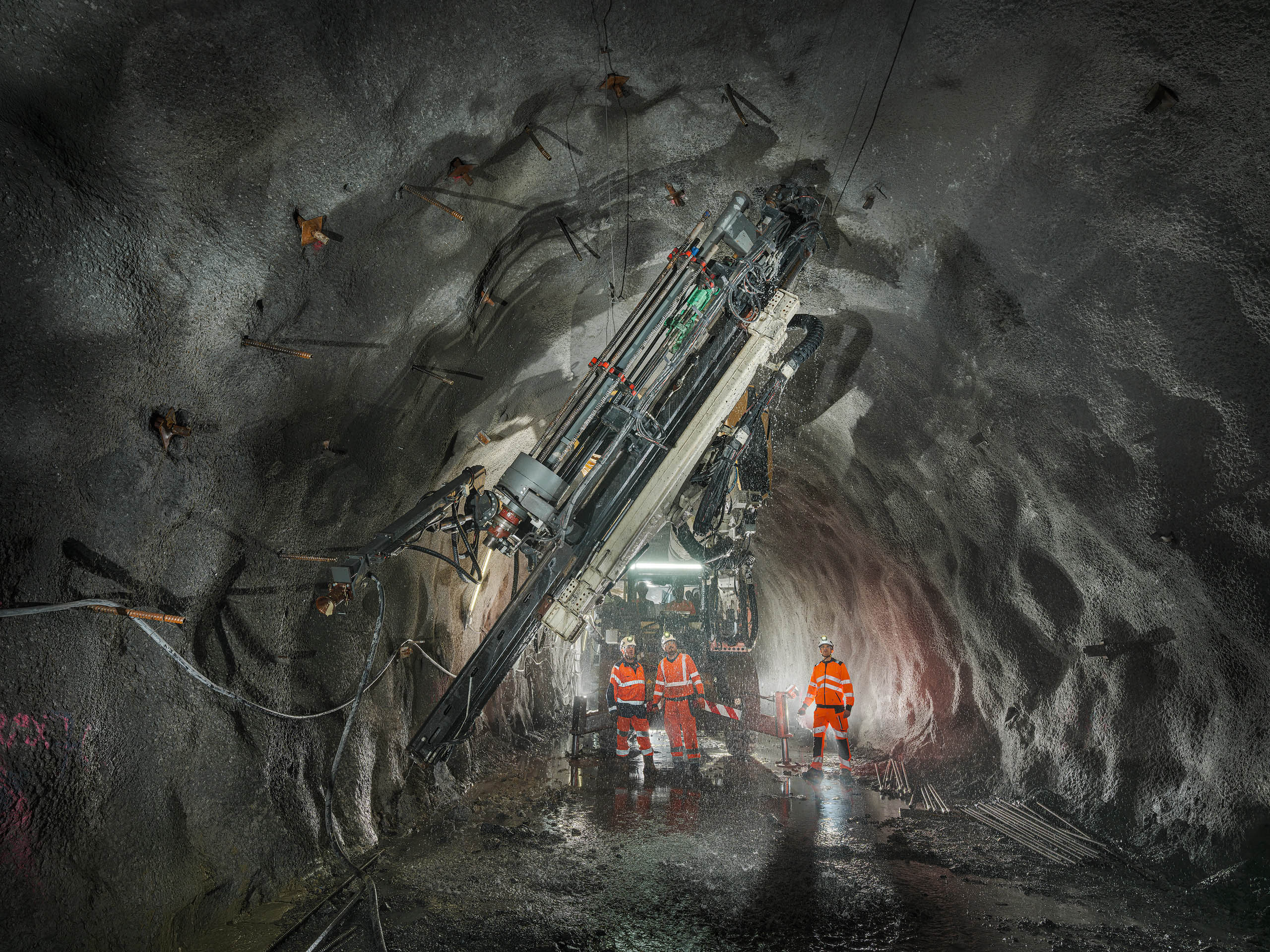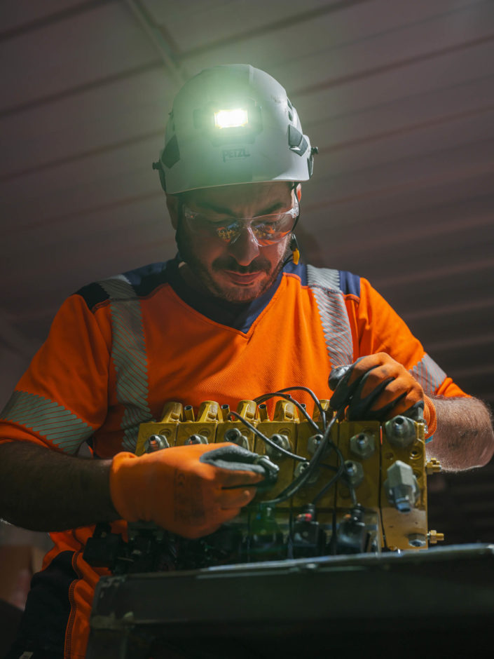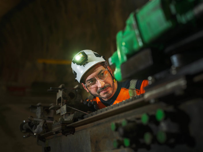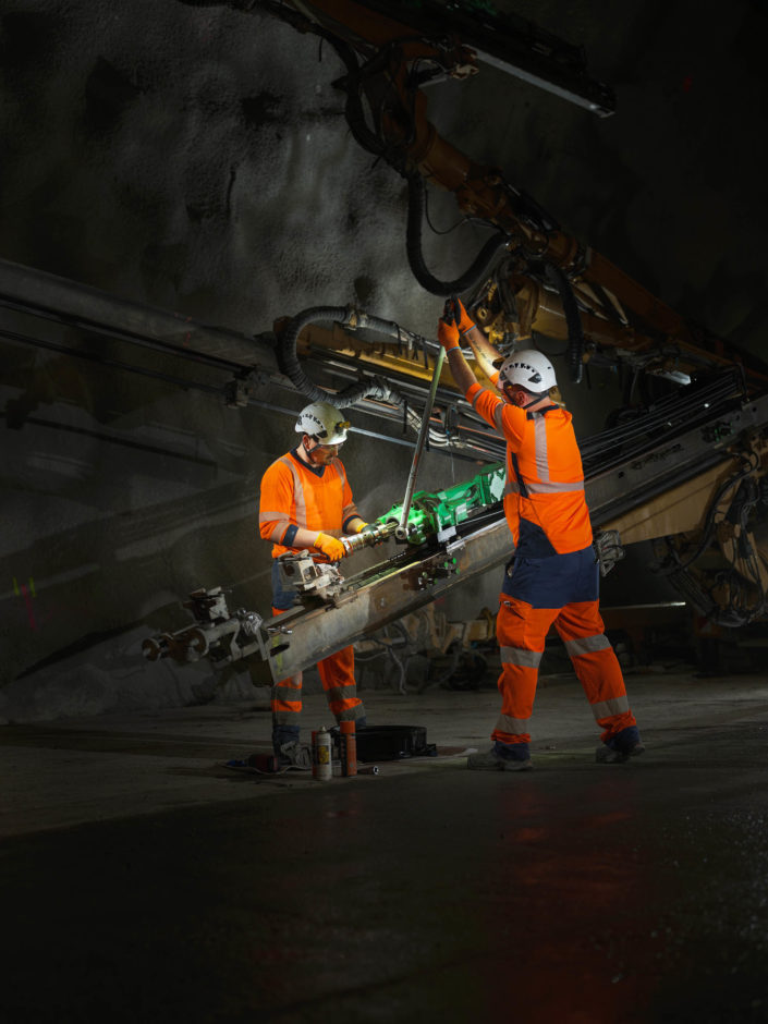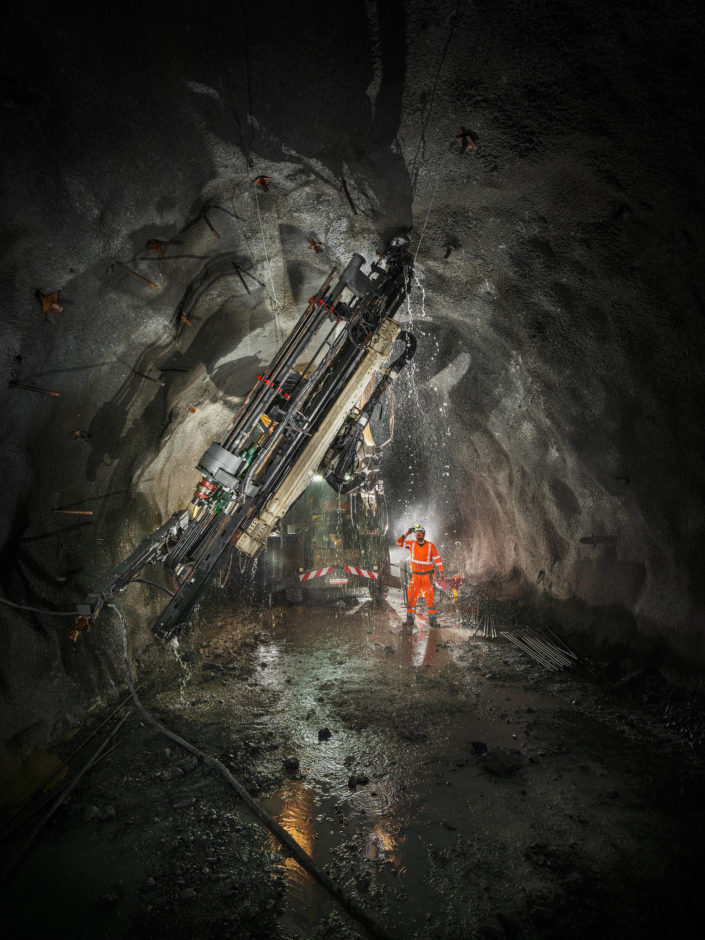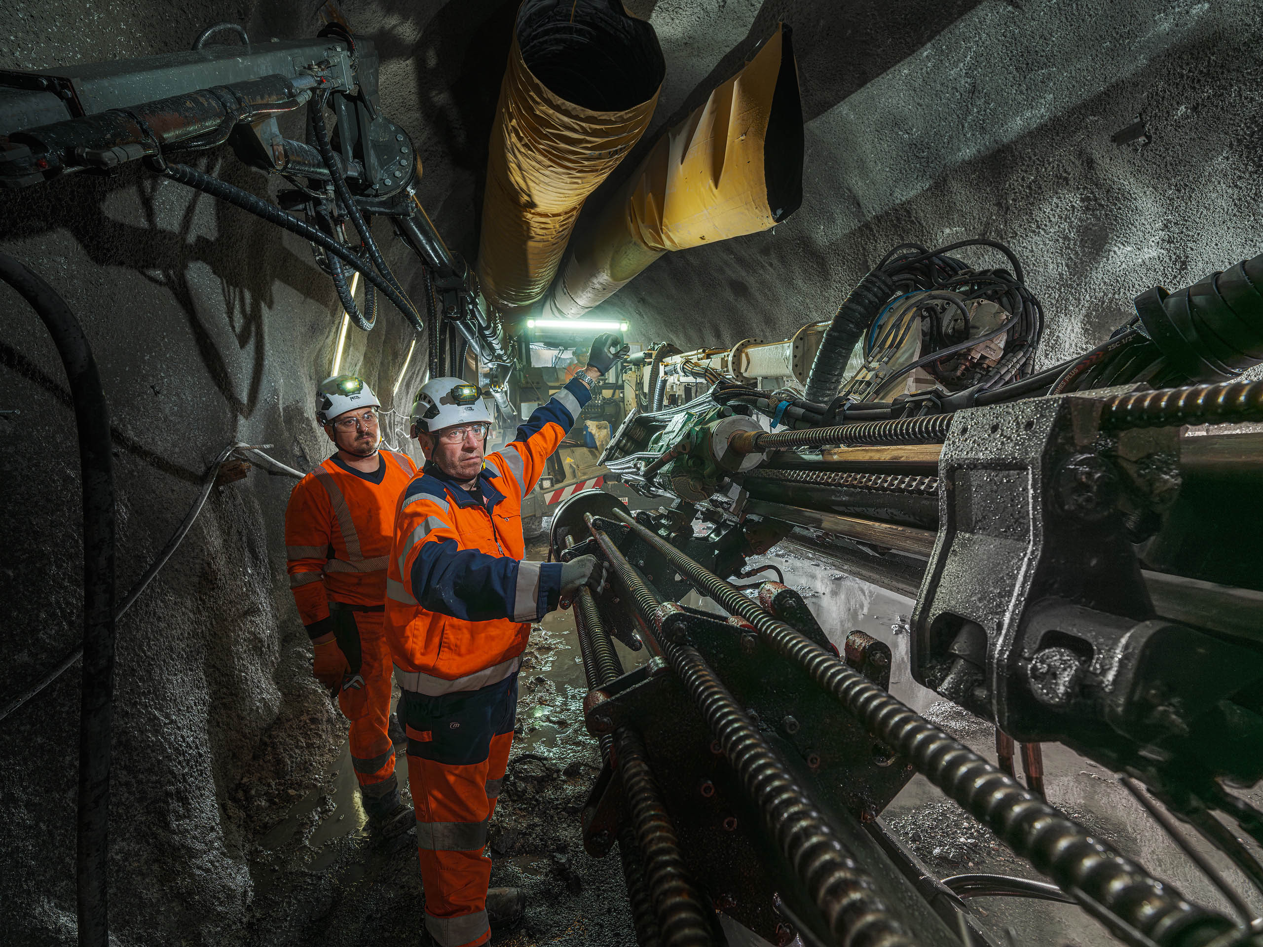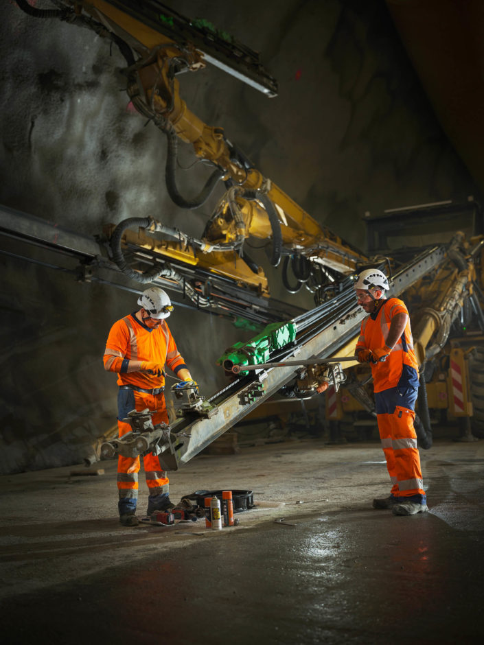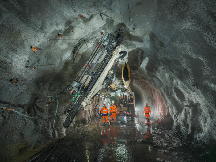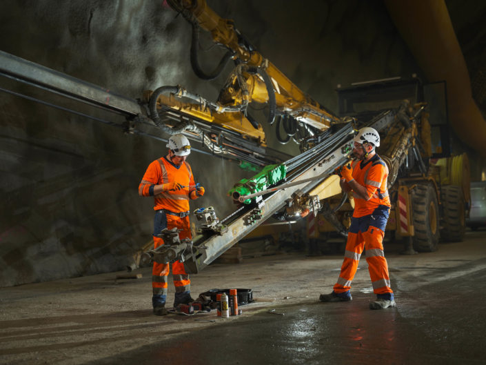 Les jumbos de foration percent la roche avec précision pour les phases de sondage, forage et confortement. À proximité du front de taille, les équipes de maintenance Robodrill assurent une présence continue. Leur expertise garantit la fiabilité des équipements, la sécurité des opérateurs et la performance globale du chantier du Tunnel ferroviaire Lyon-Turin.