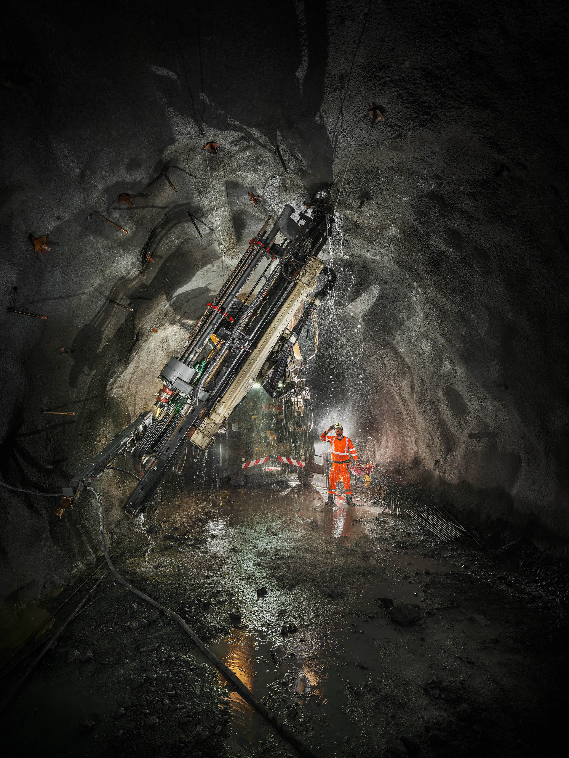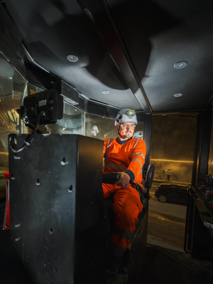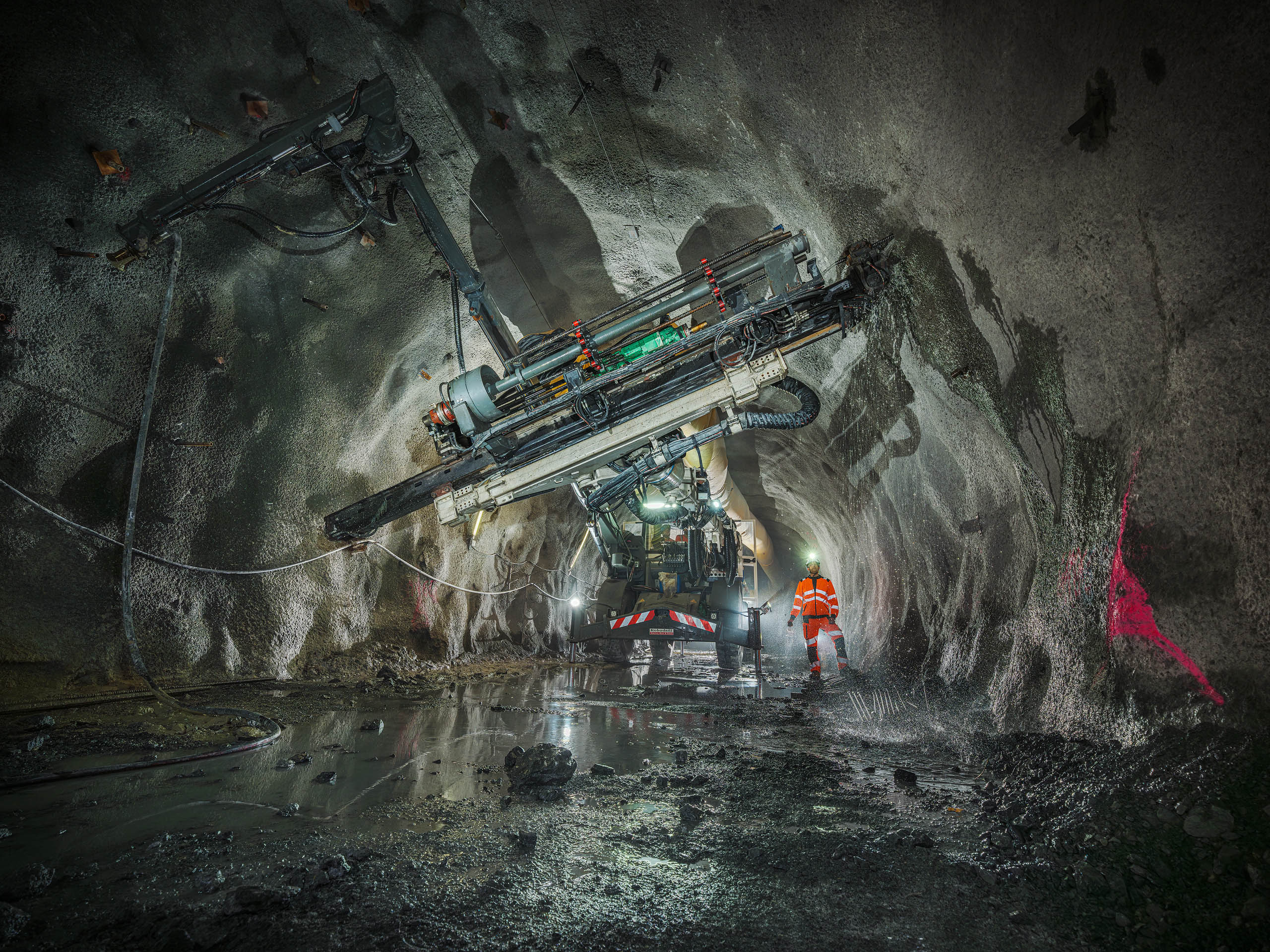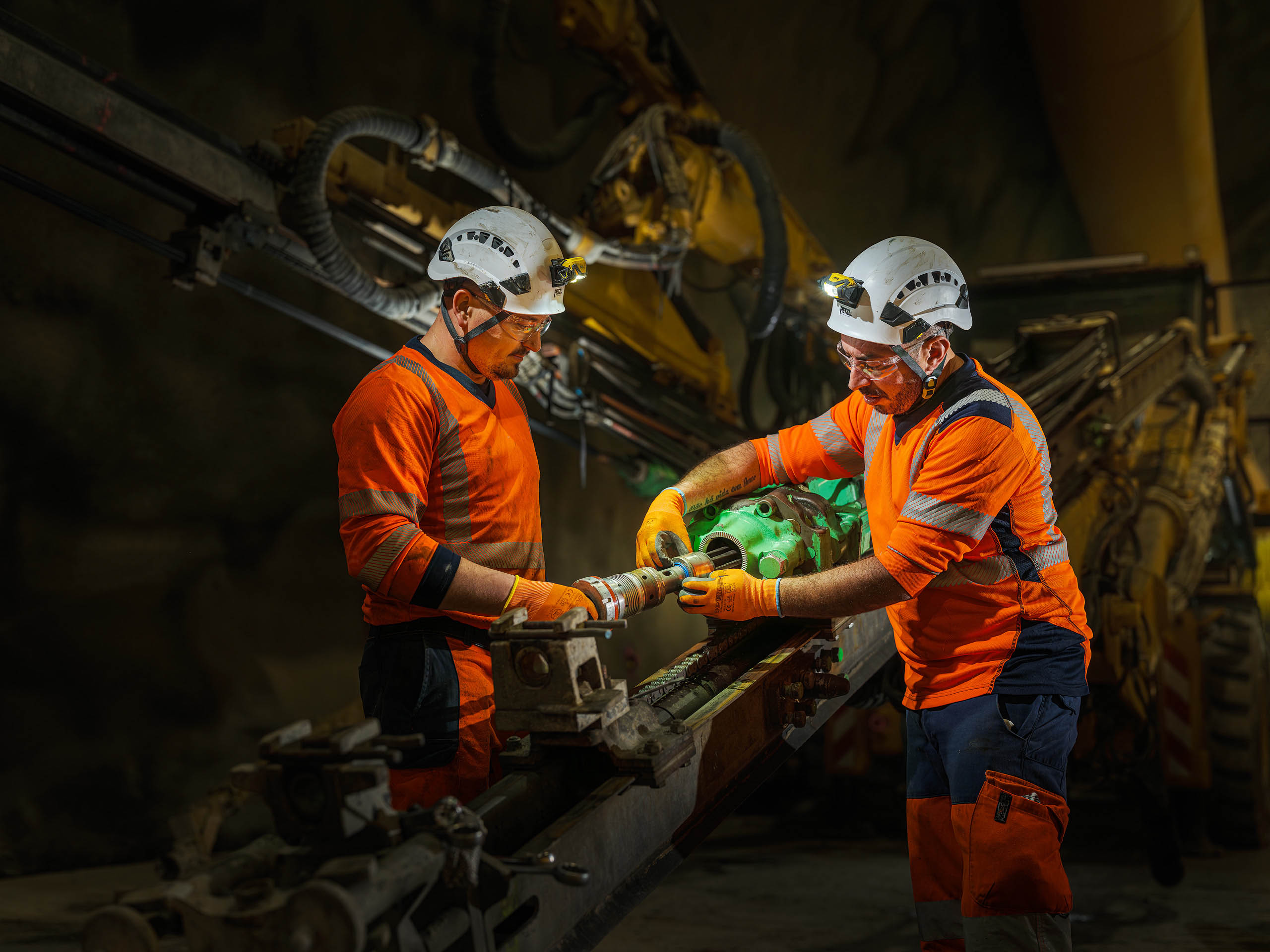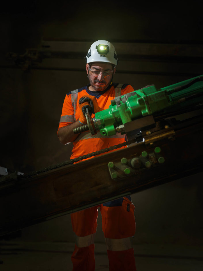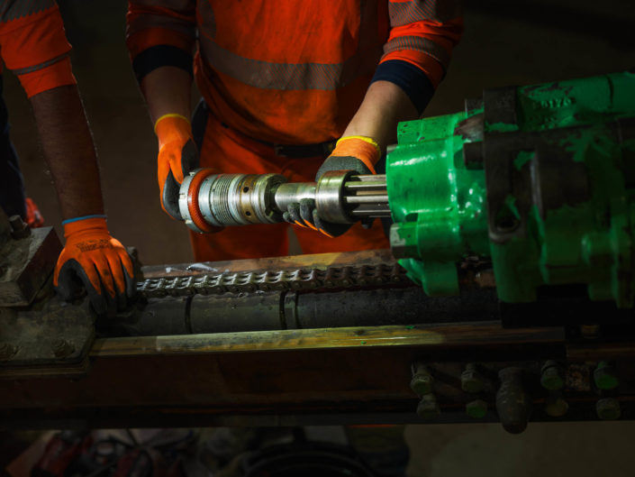 Les jumbos de foration percent la roche avec précision pour les phases de sondage, forage et confortement. À proximité du front de taille, les équipes de maintenance Robodrill assurent une présence continue. Leur expertise garantit la fiabilité des équipements, la sécurité des opérateurs et la performance globale du chantier du Tunnel ferroviaire Lyon-Turin.